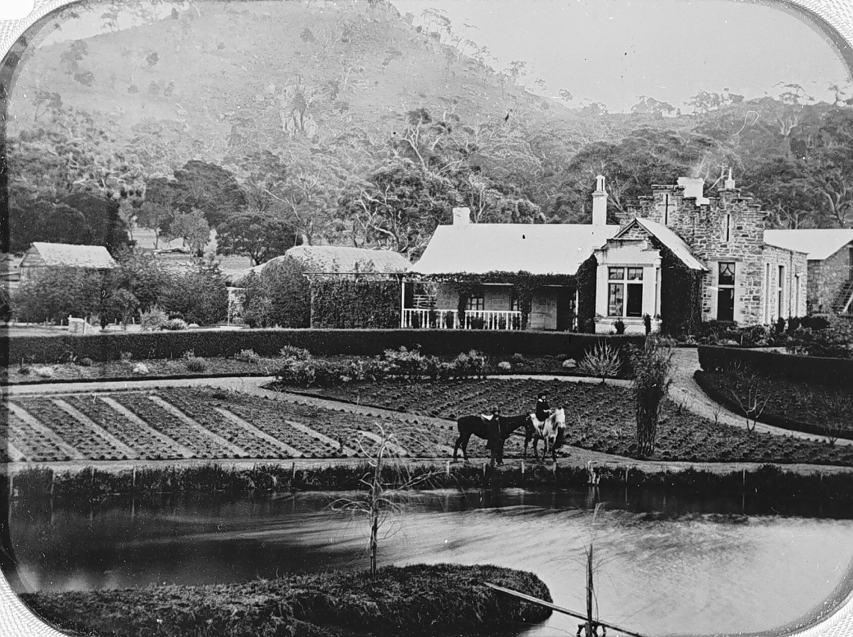 'Ercildoune' homestead lake and gardens. There is a woman on horseback in the foreground and a second, saddled, horse which does not have a rider.