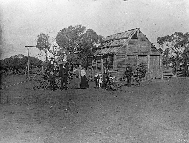 A group of people with carriages and a pram in front of a slab-sided barn.
