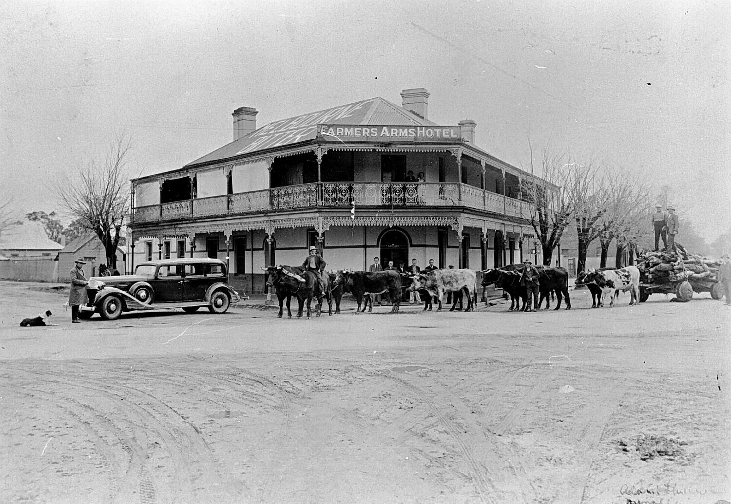 A bullock team and car outside the Farmers Arms Hotel, Benalla.