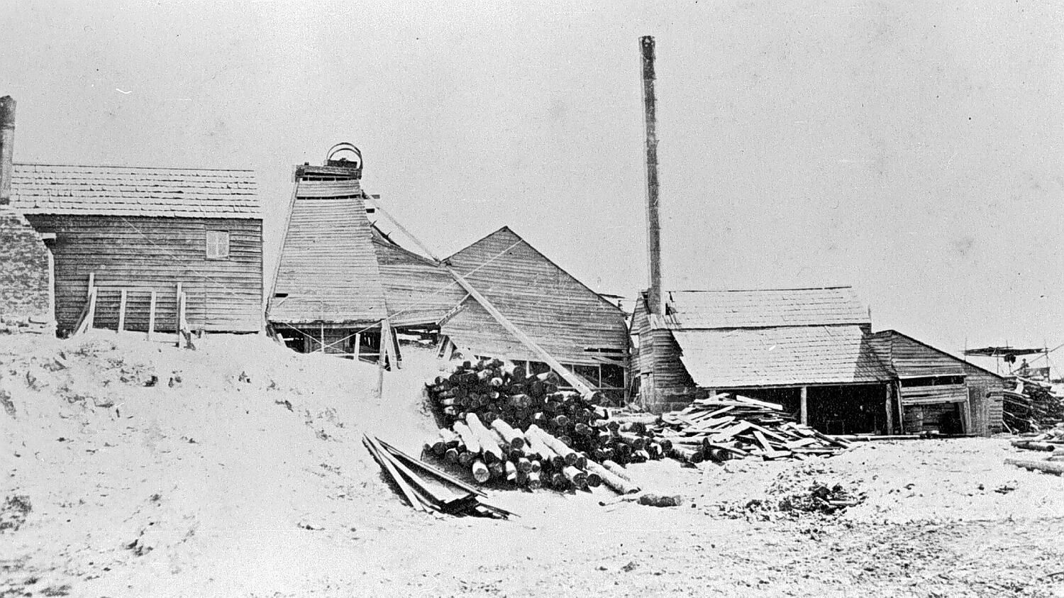 Mine buildings, including poppet head, chimney and stacks of wooden props.