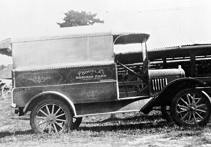 The first milk delivery motor van at T. Douglas' ''Roxburgh Farm'. Van is a Model T Ford.