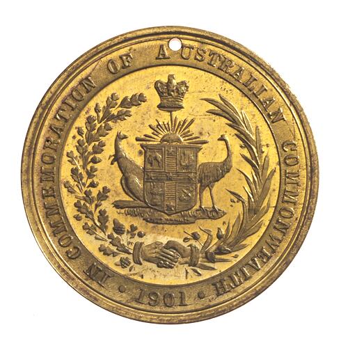 At centre within wreath crowned Australian Arms supported by emu and kangaroo; around, COMMEMORATION OF AUSTRALIAN COMMONWEALTH . 1901 .