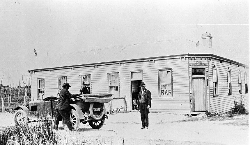 Two men and a woman with their car outside the Wattle Hill Hotel.