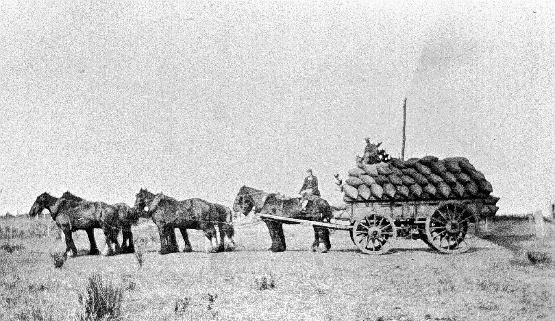 A six-horse team pulling a wagon laden with grain.