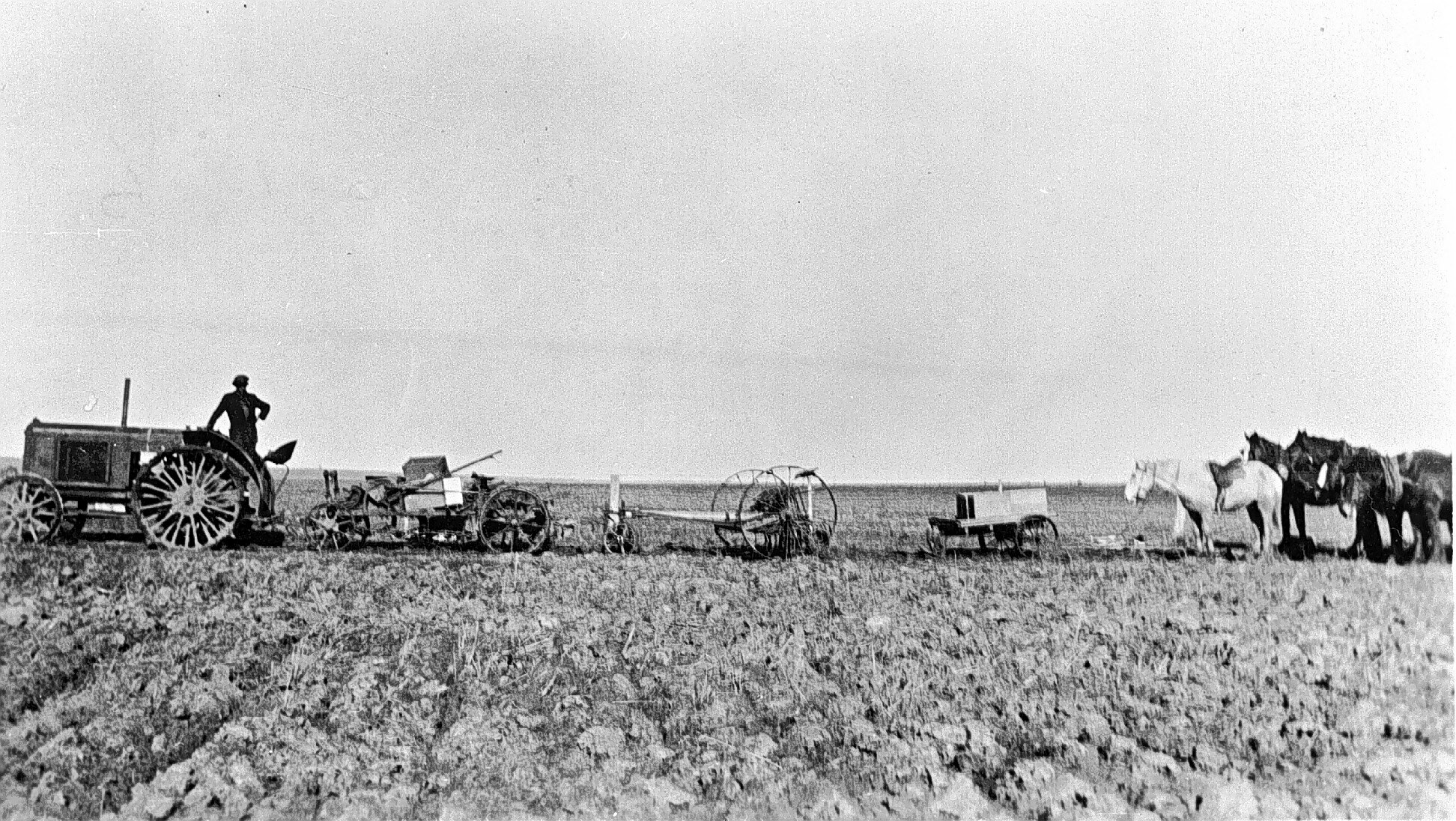 A tractor, various farm implements and two saddled horses.