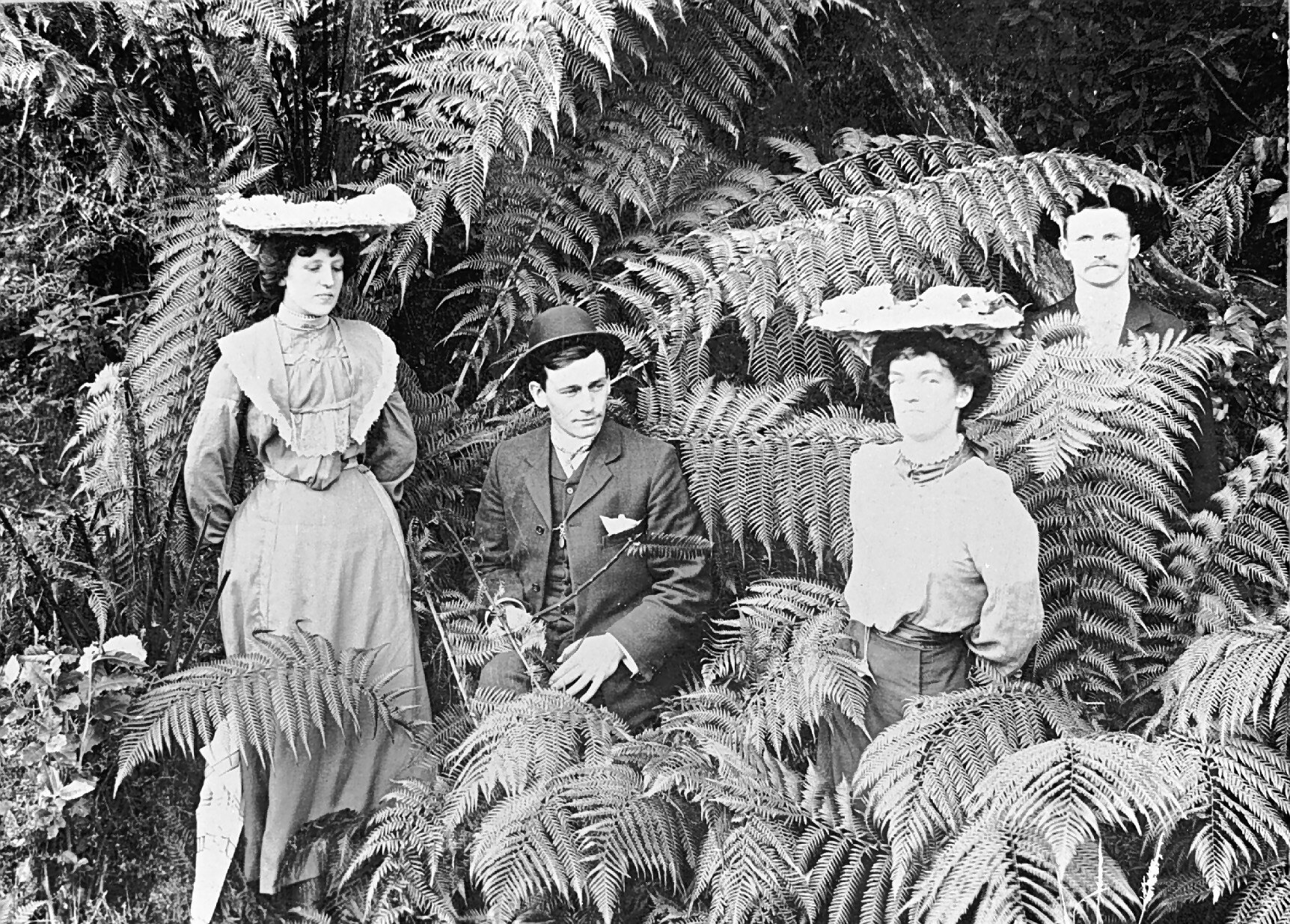 Two couples amid tree ferns. The woman are wearing very large flat hats.