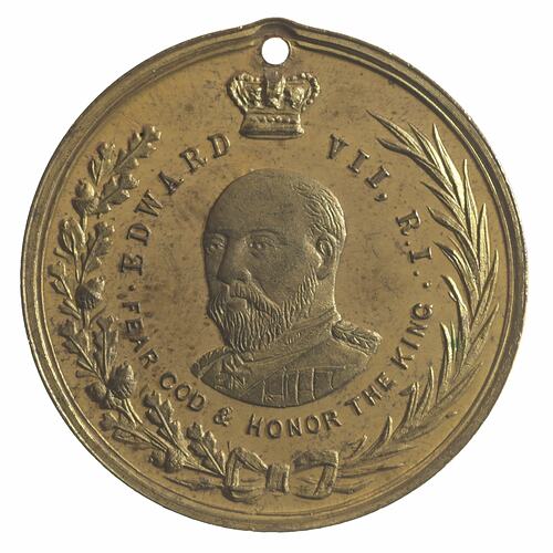 3/4 bust of Edward VII crown above, around within wreath, EDWARD VII R.I. . FEAR GOD HONOR THE KING.