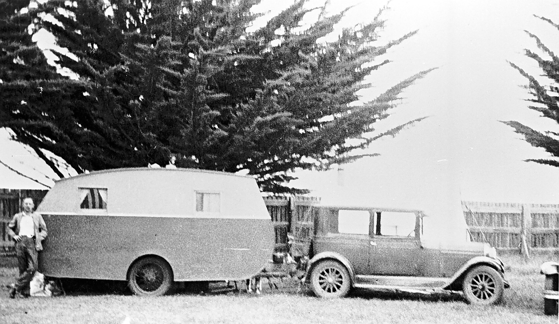 A man with a caravan hitched to a Pontiac car.