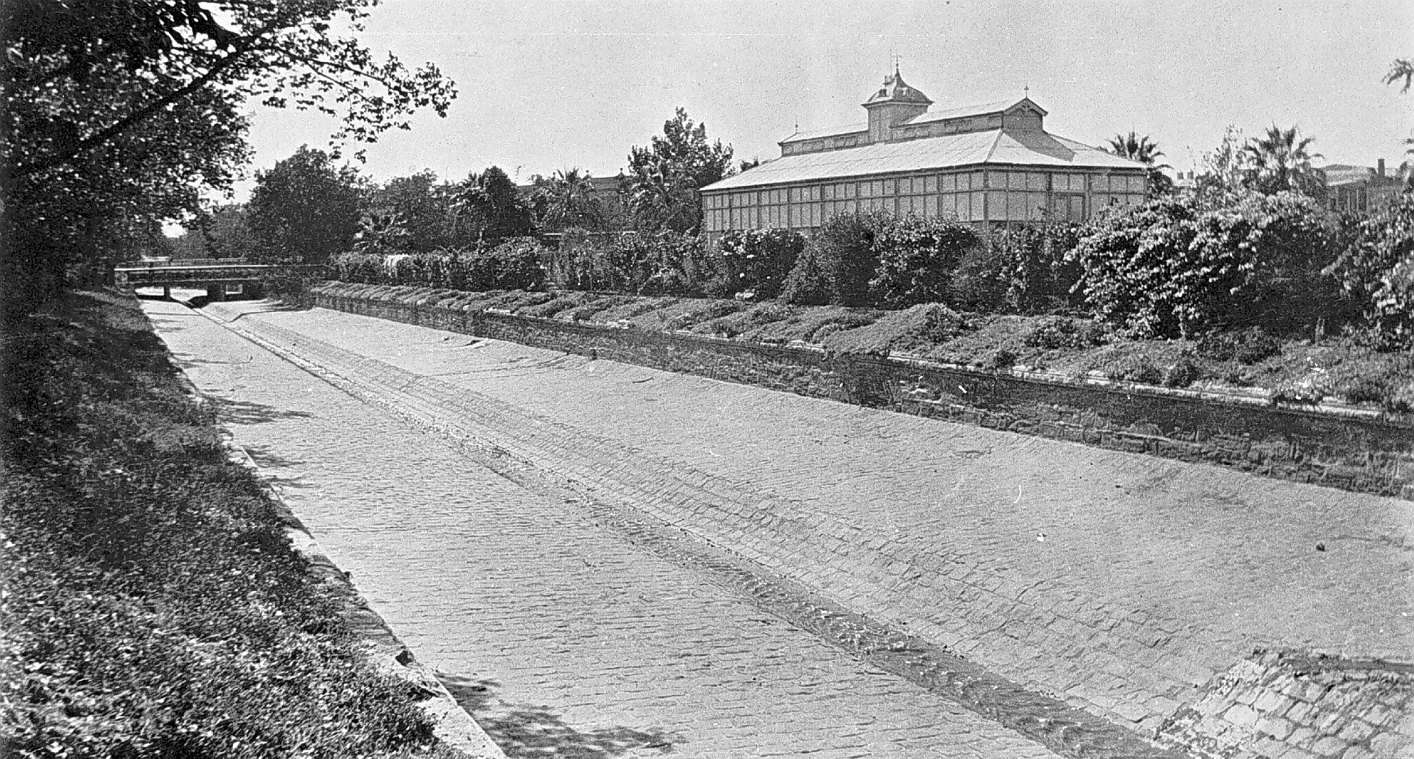 The Bendigo Botanical Gardens. There is a water channel in the foreground and a large conservatory in the background.