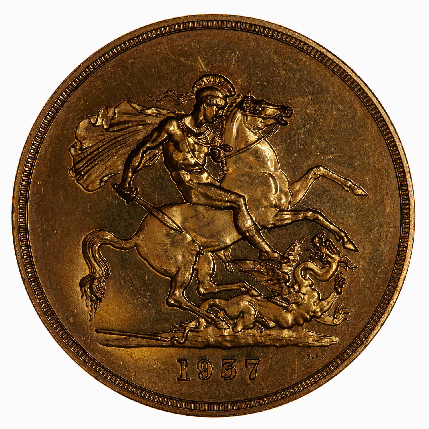 St George on horseback advancing to right wearing a helmet and cape and holding a sword; below horse, fallen dragon with lance in its side; below exergue line at right the artist's initials B.P. (Benedetto Pistrucci); in exergue, 1937