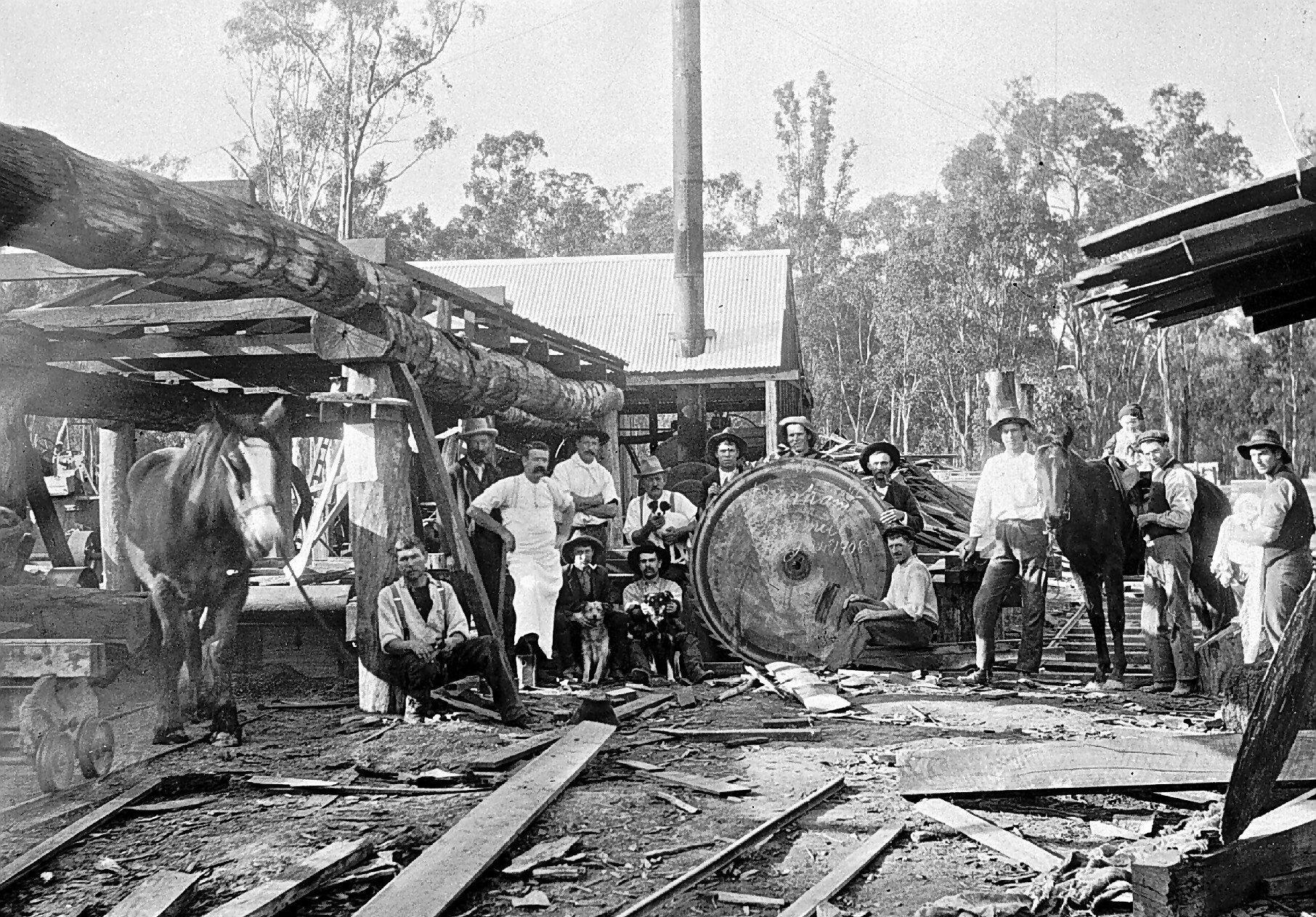 Dogs, Domestic Animals, Horses, Industrial Equipment, Sawmills, Timber Workers, Workers