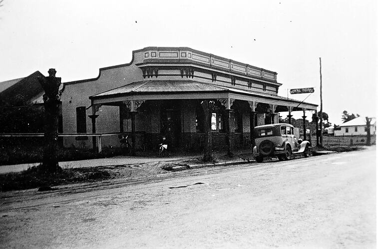 A motor vehicle parked outside the Royal Hotel in a country town.