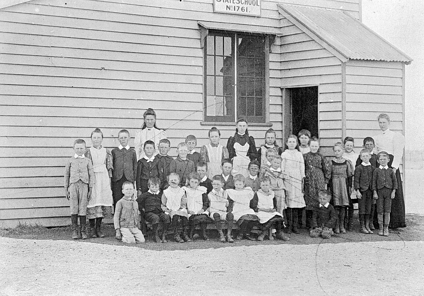 A group portrait of teacher and pupils at the Rupanyup State School no 1761.