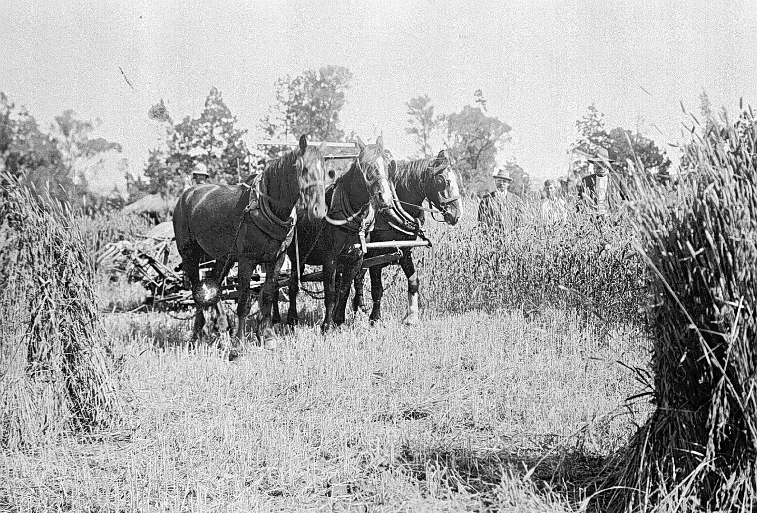 A team of three horses harvesting a grain crop.