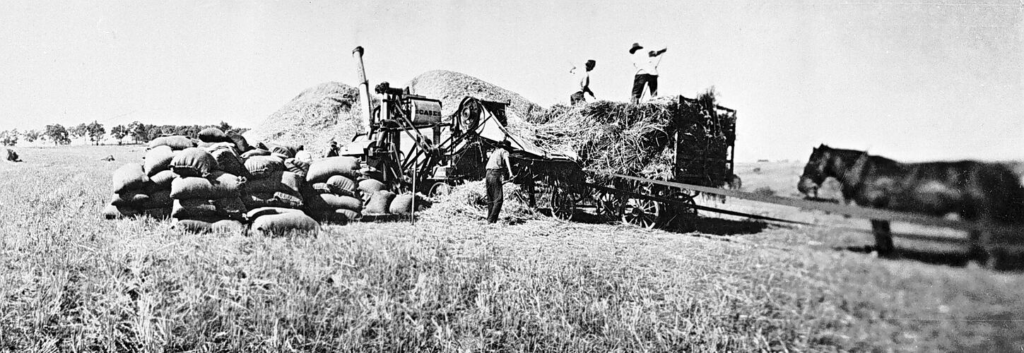 Agricultural Equipment, Agricultural Produce, Agricultural Workers, Cereal Crops, Drays & Wagons, Farms, Haystacks, Horses, Sacks, Threshing Equipment