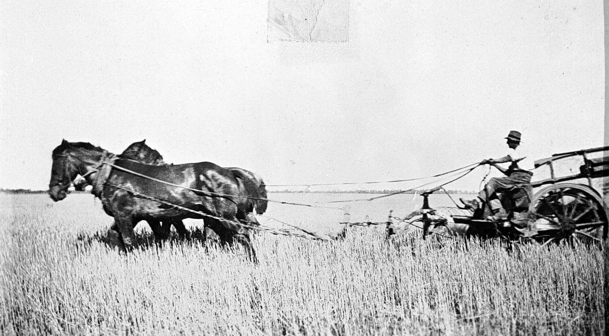 Man with a horse-drawn stripper, harvesting a grain crop at Manangatang.