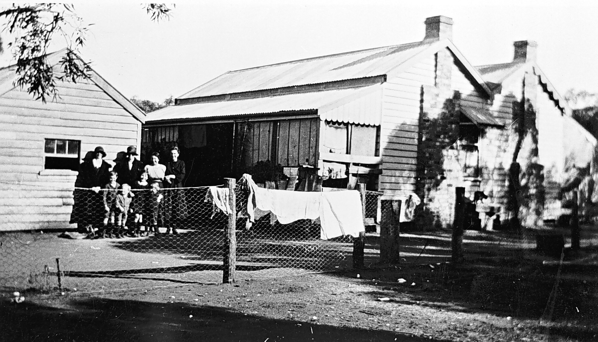 A group of women and children at the back of a house. There is washing spread on the fence.