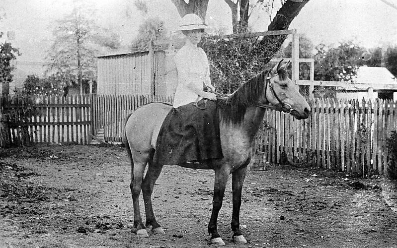 A woman on horseback. She appears to be riding astride while wearing a full divided skirt.