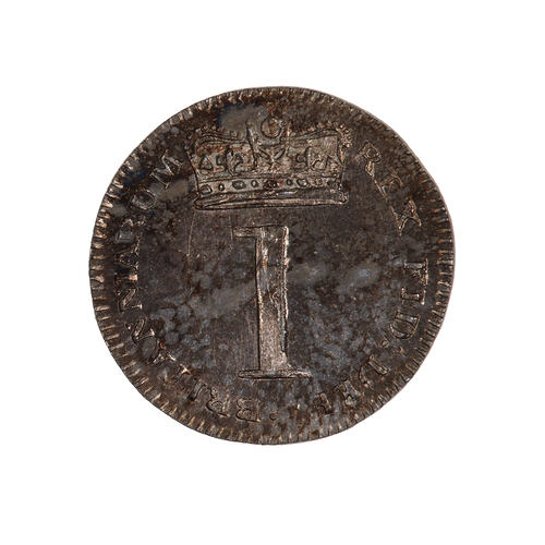 At centre a numeral 1 with a large crown above; around, REX FID DEF BRITANNIARUM the top of the crown divides the legend.