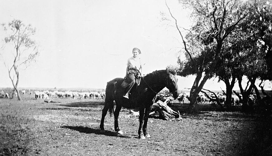 A woman on a horse. There is a flock of sheep in the distance.