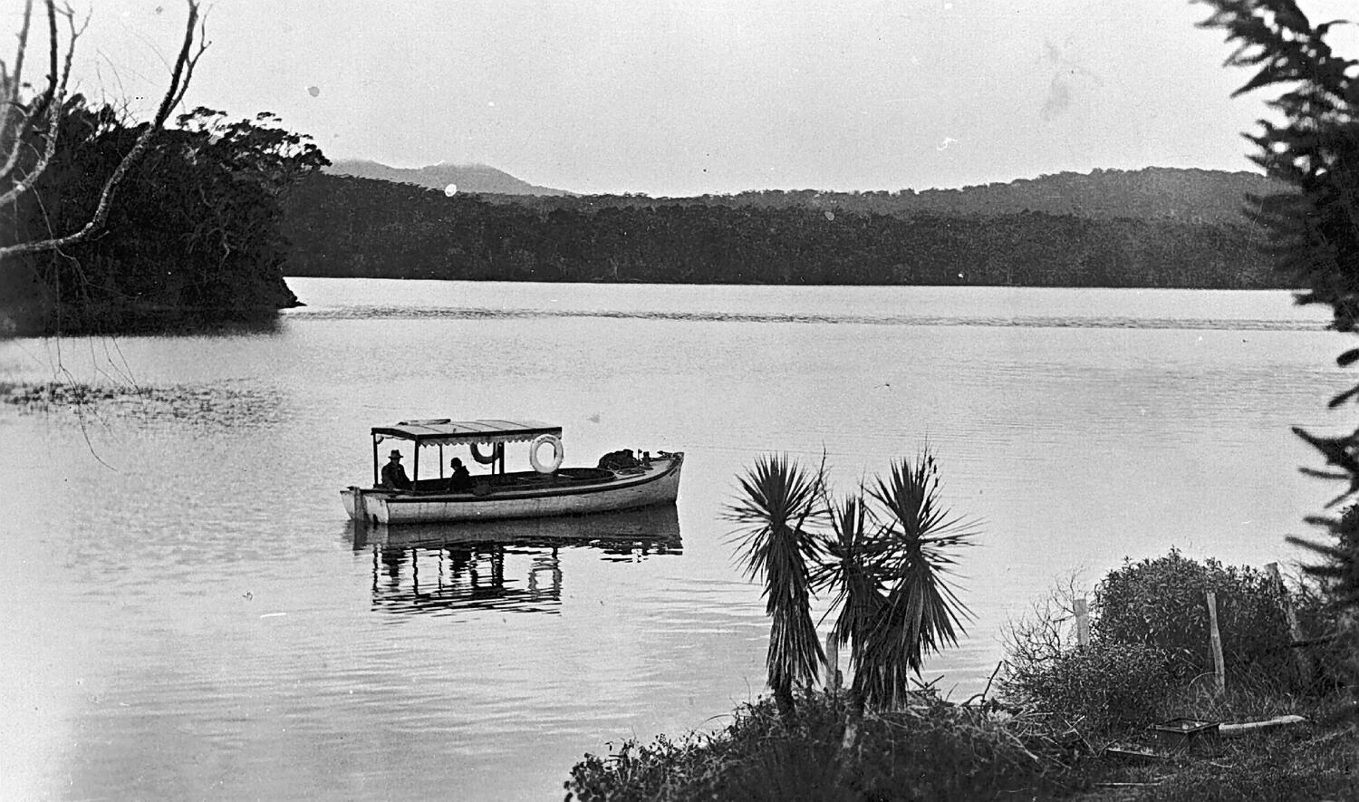 A launch on the Mallacoota Lakes. The launch has a canopy at the stern.