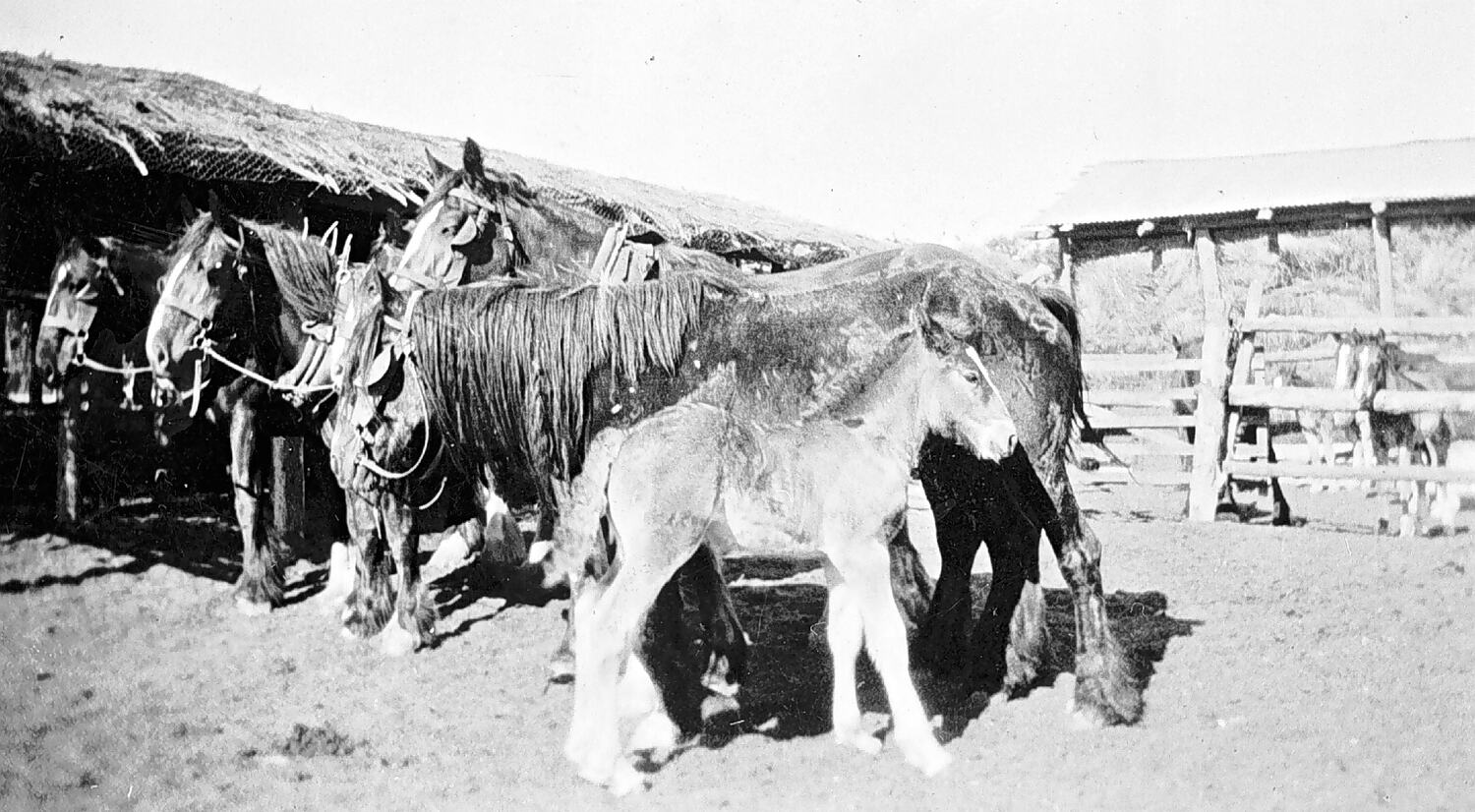 The stock-yards at Pine Grove farm. There is a foal in the foreground. The stables are thatched and open at the sides.
