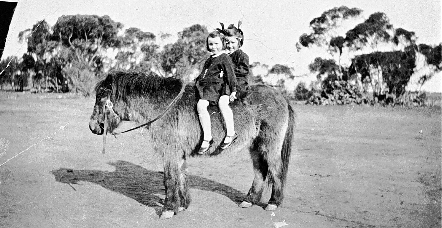 Two young girls on a pony on 'Pine Grove' farm.