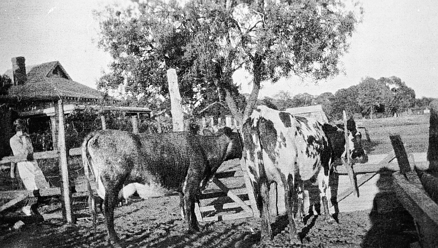 Cows in a pen on 'Pine Grove' farm. The farm house is in the background. A woman is standing on the left.