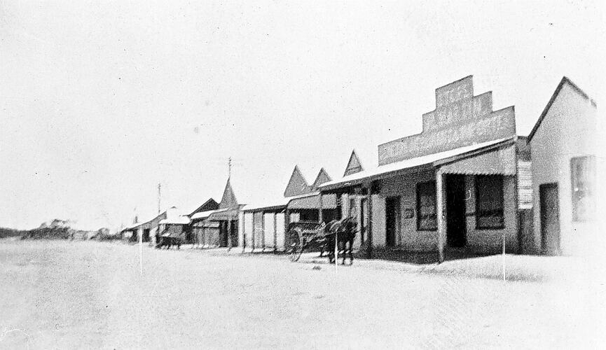 The main street in Managatang. There is a horse and buggy in front of a shop on the right.