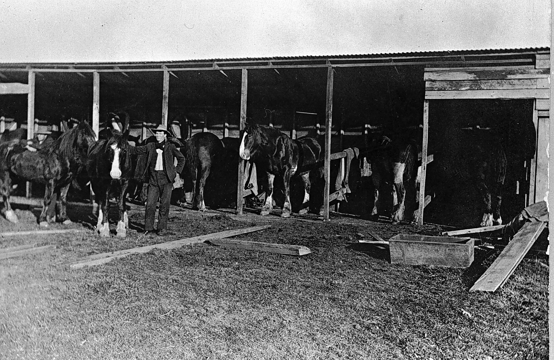 A man stands, holding a horse, in front of stables filled with horses.