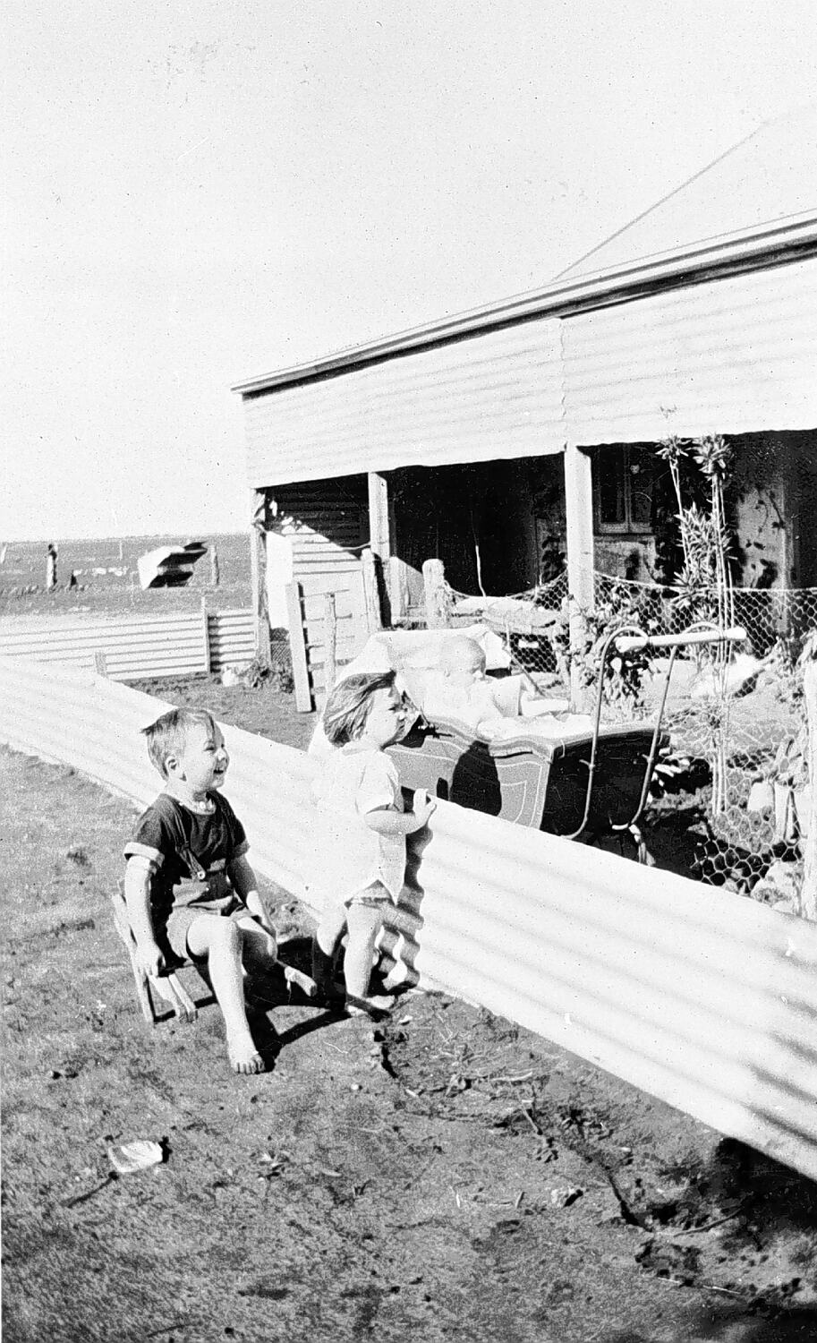 Two small children by a mouse proof fence. Behind the fence is a shed containing agricultural equipment and baby in a pram.
