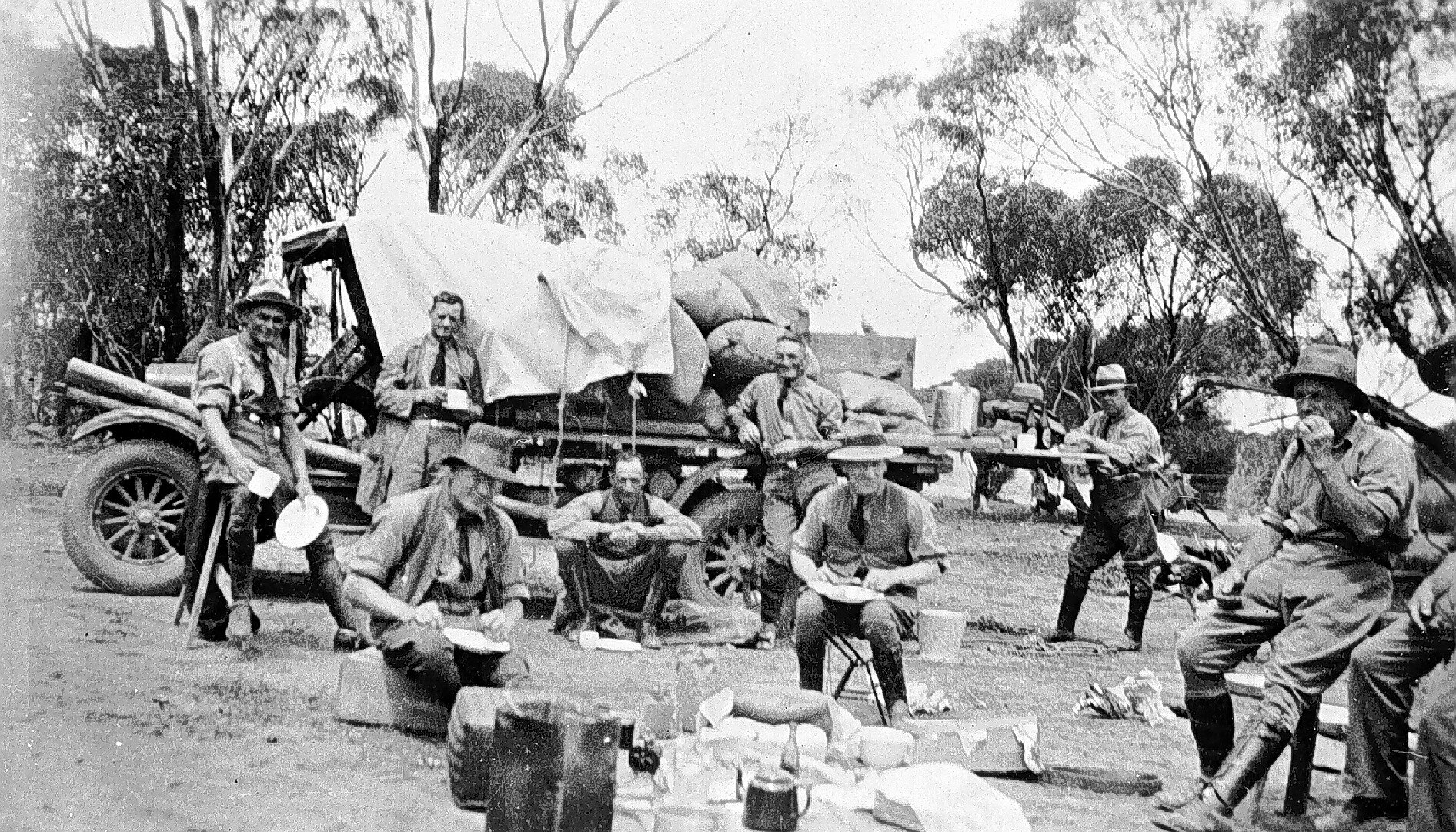 A group of returned soldiers who had settled on farms in the Mallee. They rode horses to Melbourne to place wreaths on the Shrine of Remembrance. They have stopped for a meal. There is a truck loaded with sacks of chaff in the background (probably to provide feed for the horses).