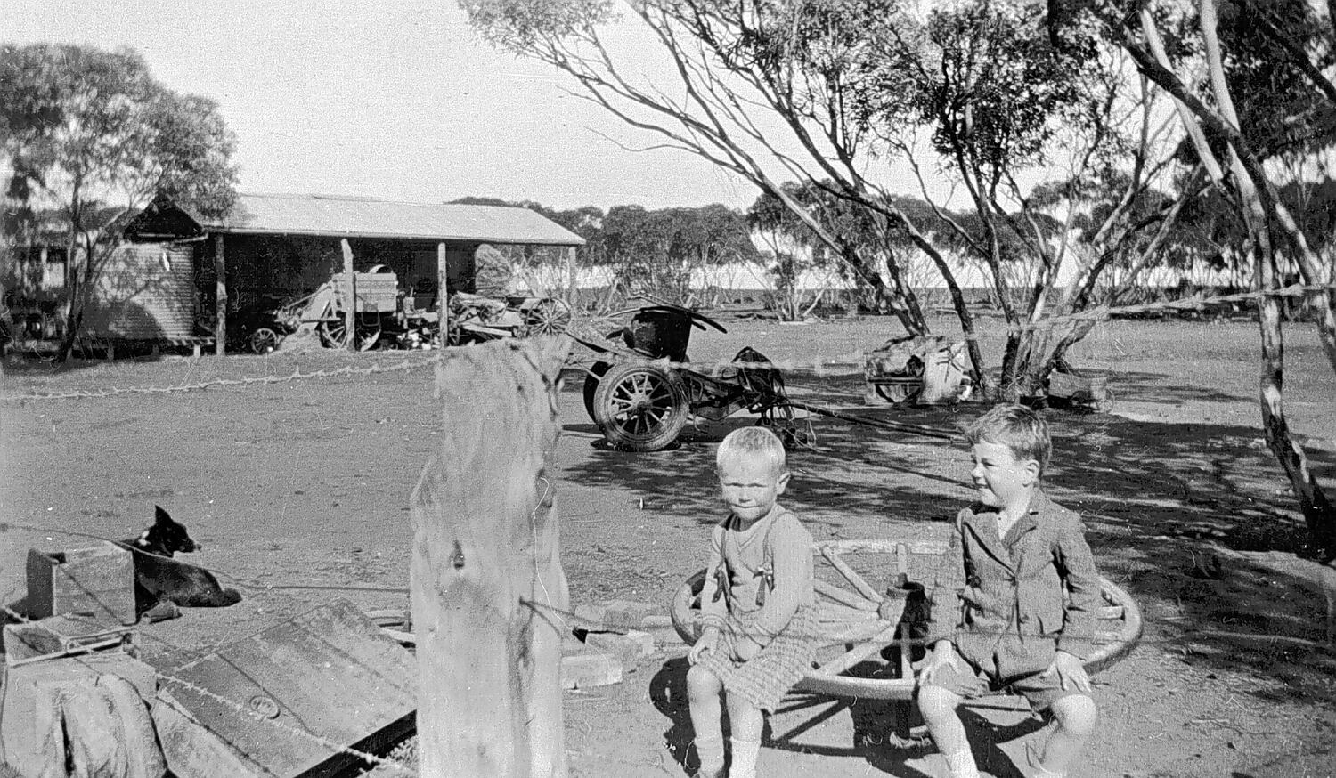 Two small boys seated on a wagon wheel. There is a carriage behind them and a shed containing bales of hay in the background.