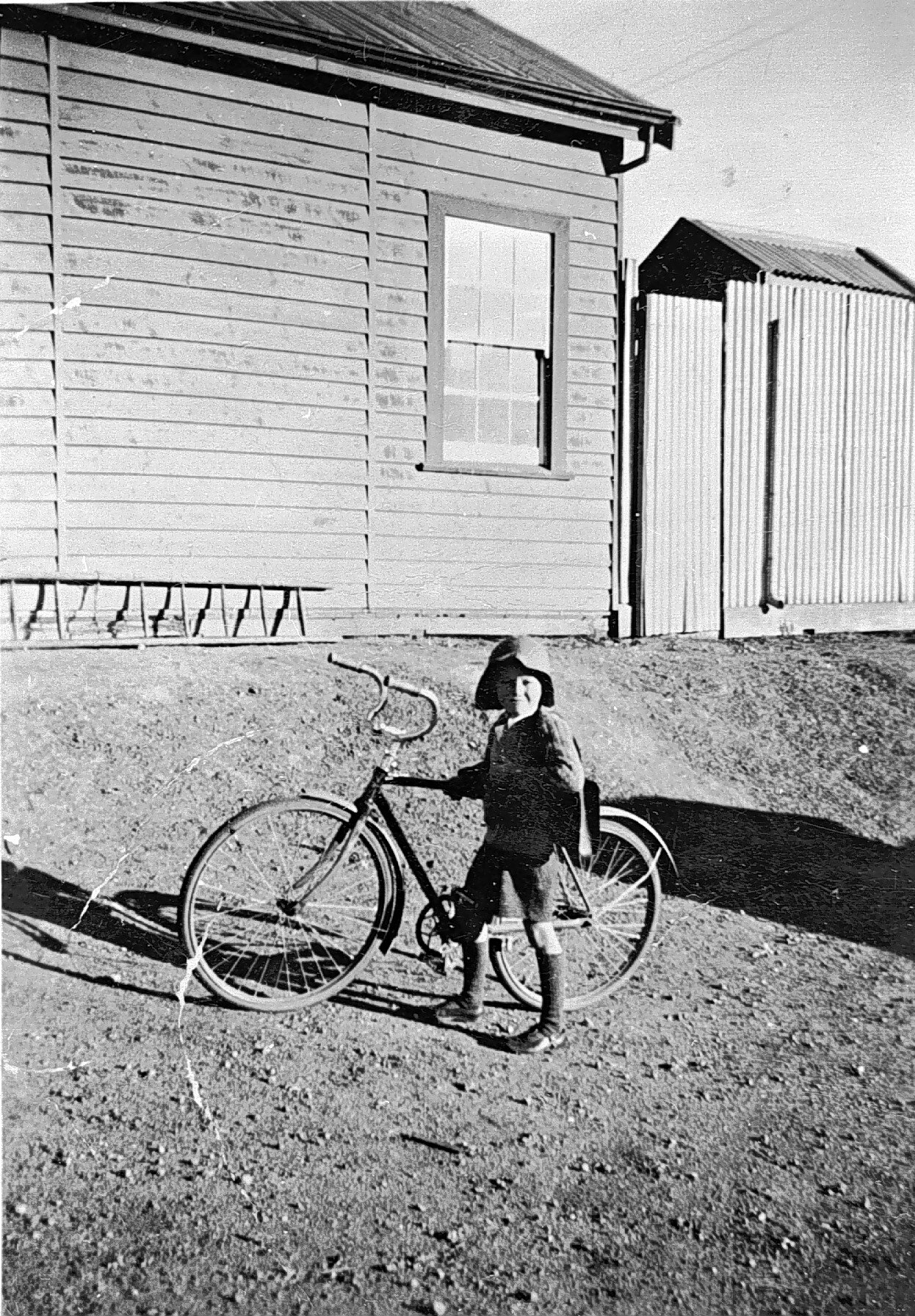 A small boy with an adult-sized bicycle. There is a house behind and a ladder leaning against the house.