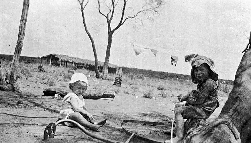 Two small children playing in a farm yard. The boy on the right is holding a stick. There is clothes line behind the children and a shed in the background.
