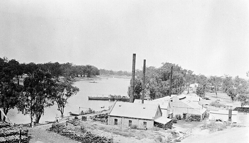 The Murray River at Mildura. The buildings in the foreground have very tall chimneys and there are large wood piles on the left.