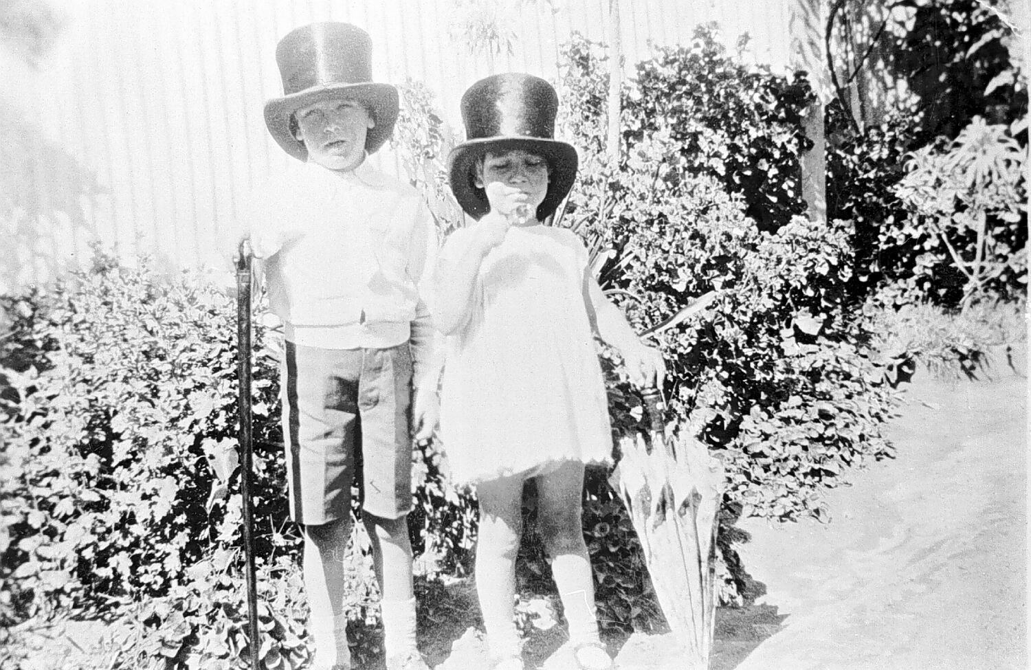 A small girl and boy both wearing large top hats. The girl holds a parasol and the boy a cane.