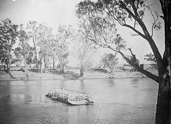 A punt loaded with sheep midstream in the Murray River.