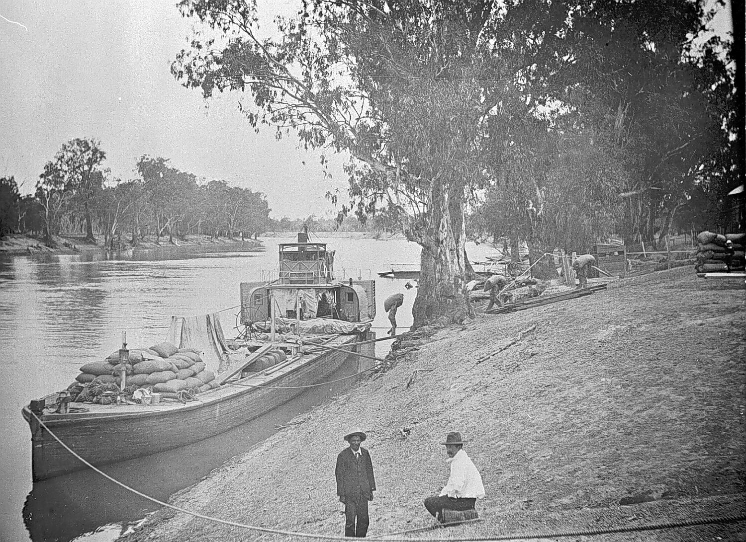 Men unloading a steam paddle boat on the Murray River.