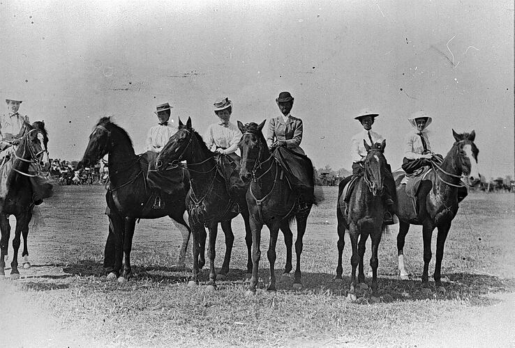 A ladies ' dressage competition at a country show. The women are all riding side saddle.