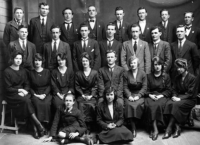 Group portrait of may shop staff. The shop is believed to have been Homfray 's Big Store.
