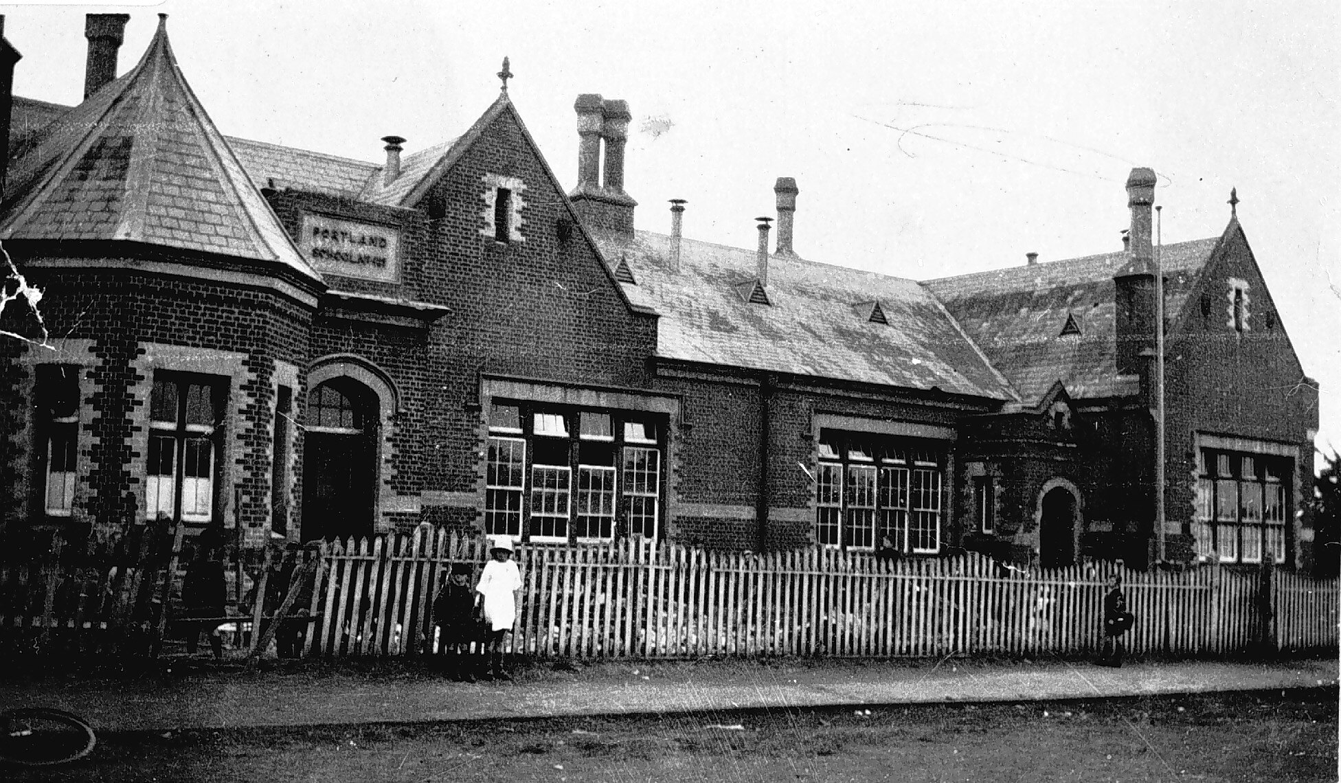 Two children in front of the Portland State School No.489.
