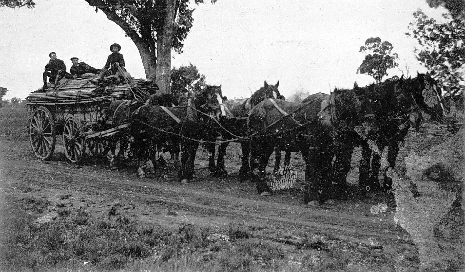 Horse-drawn wagon loaded with building material.