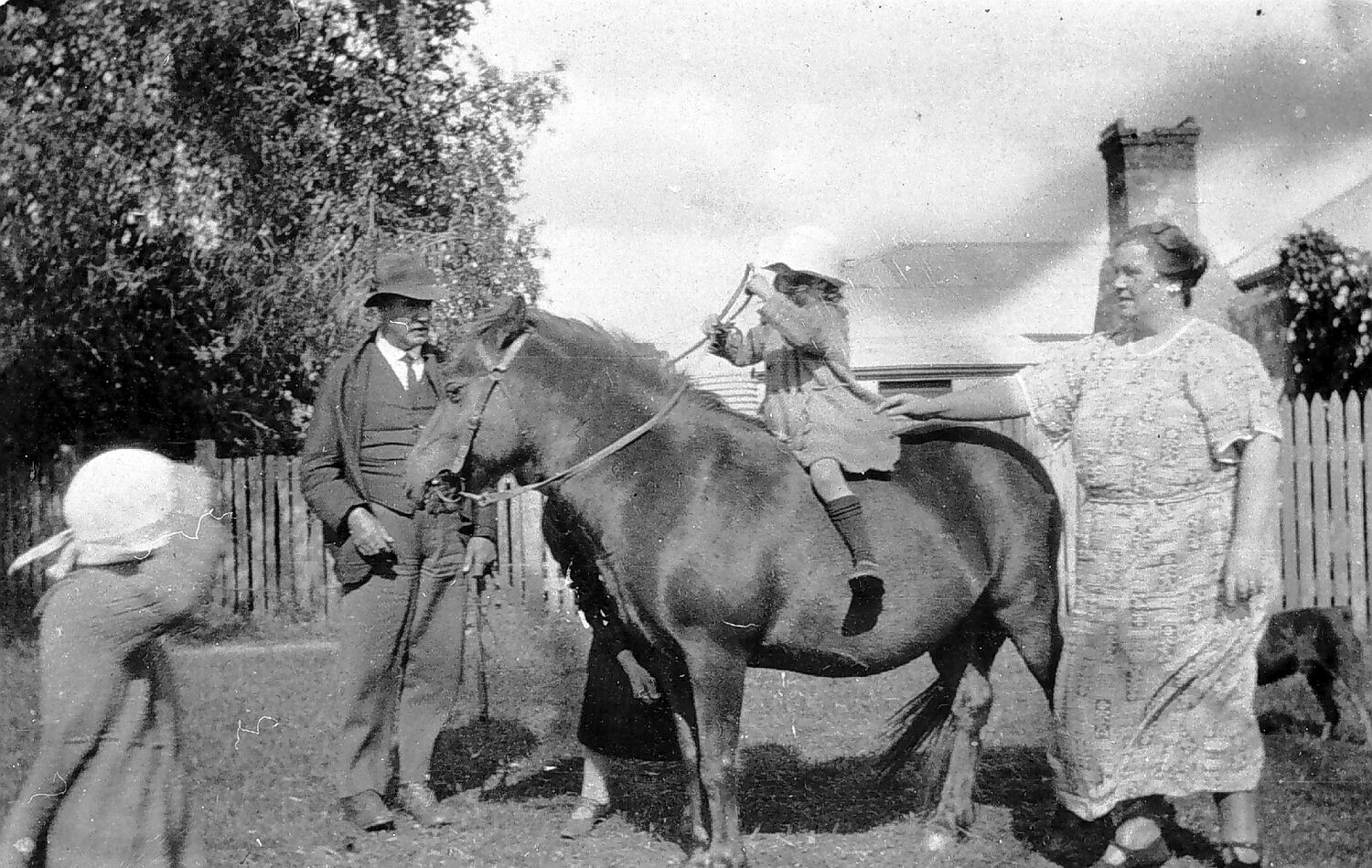 A young girl on horseback. She is riding bareback and a woman on the right is holding onto her skirt. There is a man on the left and another woman largely obscured by the horse. A small child is on the left.