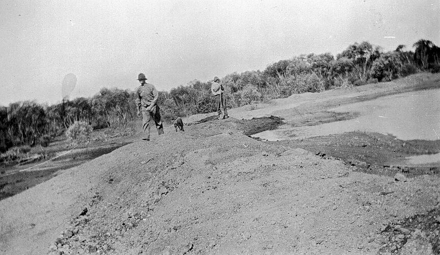 Two men and a dog on top of a farm dam.