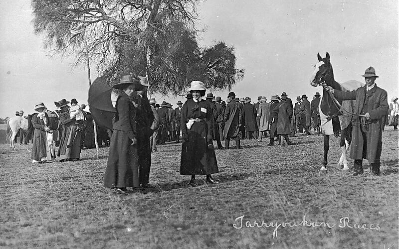 The Tarryonkan races. There is a man holding a race horse on the right and two women and a man on the left.