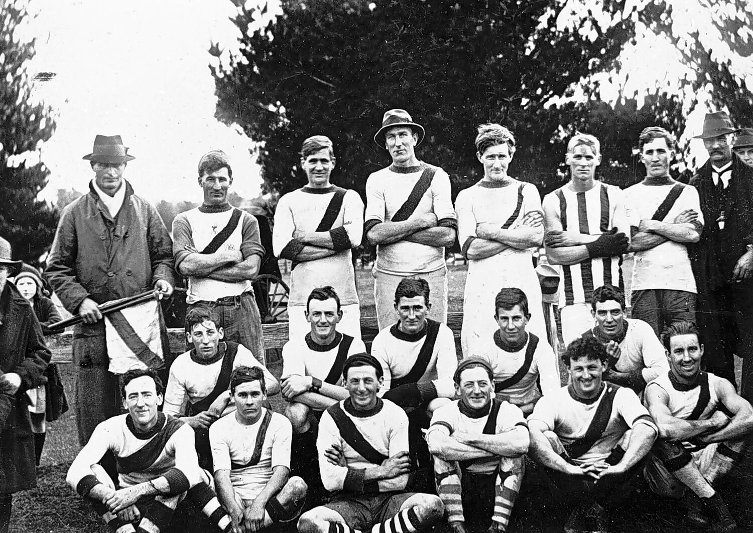 The Digby Football Team. The man standing at the left holds two flags which have a diagonal stripe. The team jumper also has a diagonal stripe although one man wears a jumper with vertical stripes.