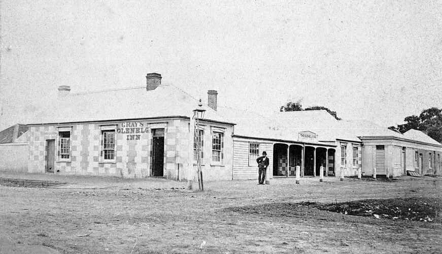 A man standing in front of Gray 's Glenelg Inn. The inn is a stone building and the stones, which are in contrasting colours, have been arranged in a chequered pattern. There is a wooden verandah and a gas light in front of the inn.