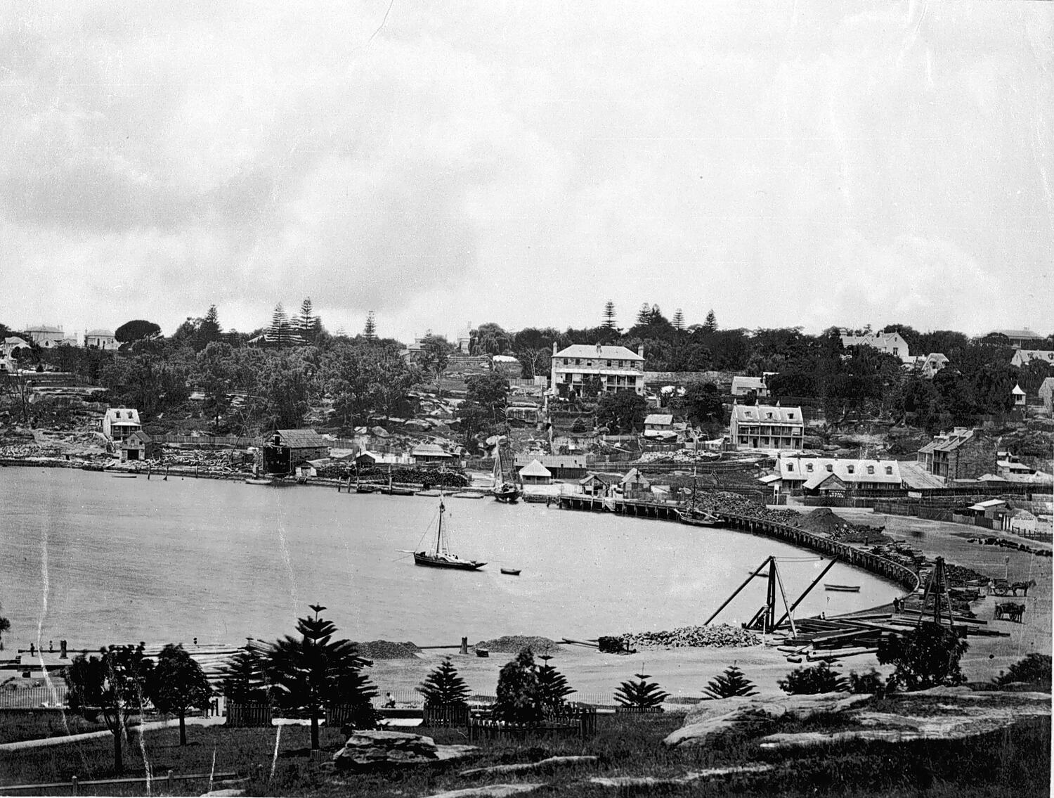View overlooking a cove on Sydney Harbour, possibly Woolloomooloo Bay or Rushcutters Bay. There is a lone yacht, small single-masted trading vessel like a cutter anchored in the bay with a small dingy moored to its stern. Two other small sailing vessels are moored near the wharves in the background. Some form of land reclaimation work appears to be underway near the foreshore with piles of rock and earth fill heaped on the timber wharves and a derrick crane and horse-drawn trays standing nearby. In the background on the hillside are several terrace houses and larger stately homes in smart garden settings with mature plantings including Norfolk Island Pines.