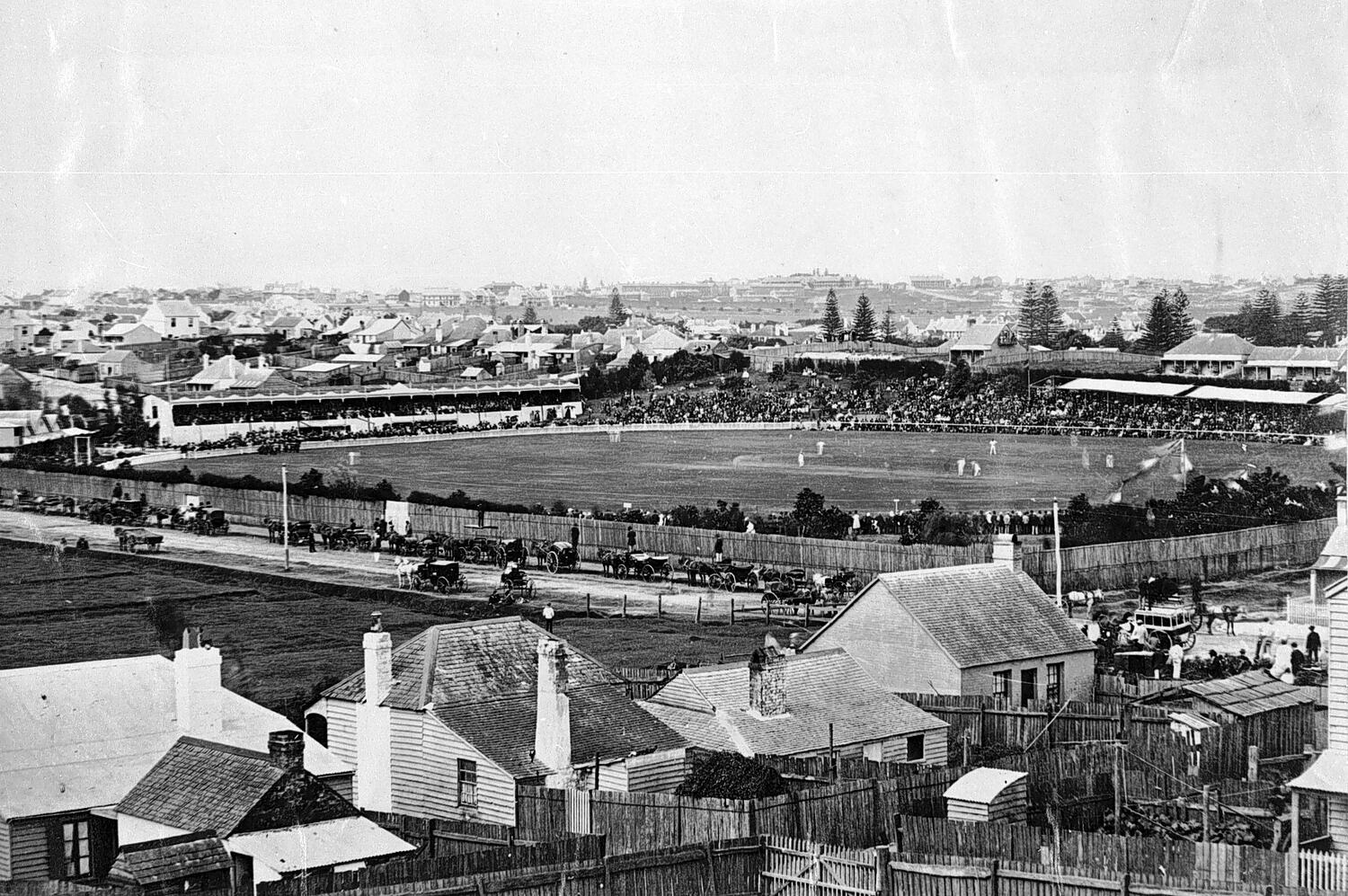 Cricket, Grandstands, Horsedrawn Vehicles, Leisure, Picket Fences, Recreation, Sport, Sports Grounds, Streetscapes, Telegraph Infrastructure, Telegraph Poles